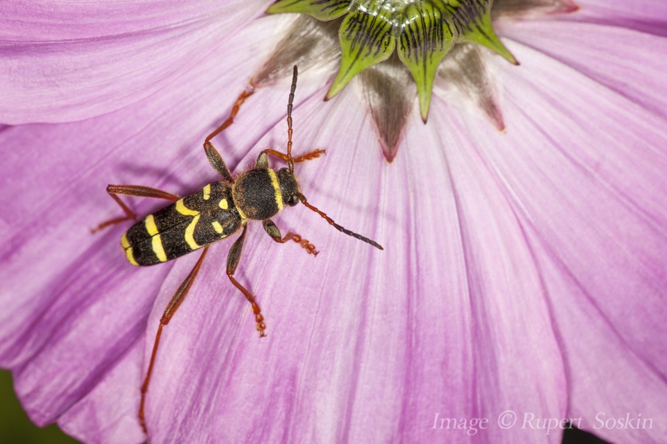 Last winter I mentioned the amount of beetle larvae that must end up on peoples' log fires every year. One log was particularly noisy last year so I brought it into the studio where the mystery larva could mature in safety. I was very happy to find this Clytus arietis sitting on the log a couple of days ago. Now released after posing very obligingly for photographs.