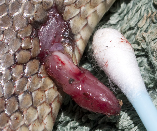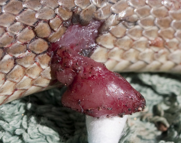 Posted on: 11/06/2011Saturday June 11th 2011Driving through the woods today I spotted this grass snake motionless by the road. I pulled over to see if it was dead and saw that it had some pretty serious injuries. It had clearly been caught by a raptor and either been dropped or the bird had been frightened off by something. The faintest movements showed that it wasn't dead so I put it in the back of the car to attempt some rescue surgery when I got home. When I opened the car door again it had hidden itself under the seat so there was clearly a bit of life left in it. However, when I started cleaning it up I realised that the protruding flesh (circled) was actually its heart. Only minutes but by the time I had fetched the medical stuff it was too late. It would almost certainly have died even if I'd managed to get the heart back in but you have to try!