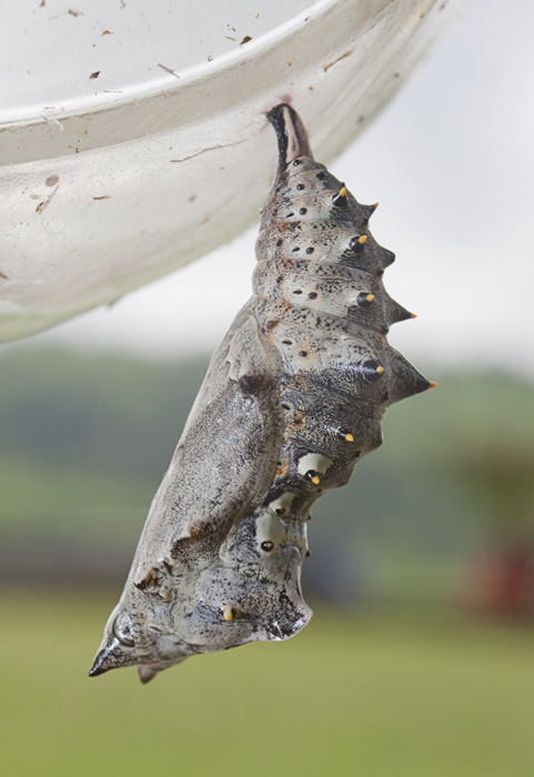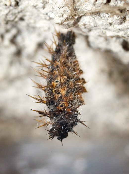 CATERPILLAR ONE: Attached itself to a solar lamp in the garden and adopted the classic 'J' position for its chrysalis stage. It remained like that all day and I was slightly annoyed that it had already shed to reveal the chrysalis when I got down early in the morning. Still, it looked very healthy so not the end of the world. Hatching usually happens after two weeks or so, depending on temperature. After 15 days of good weather it was not going to be long to wait so I checked every 30 minutes or so for signs of movement. As I approached on my last visit, from a distance I noticed some movement. Excited, I ran the last yards only to discover a wasp, eating away at the chrysalis which was already half gone and well and truly dead.
